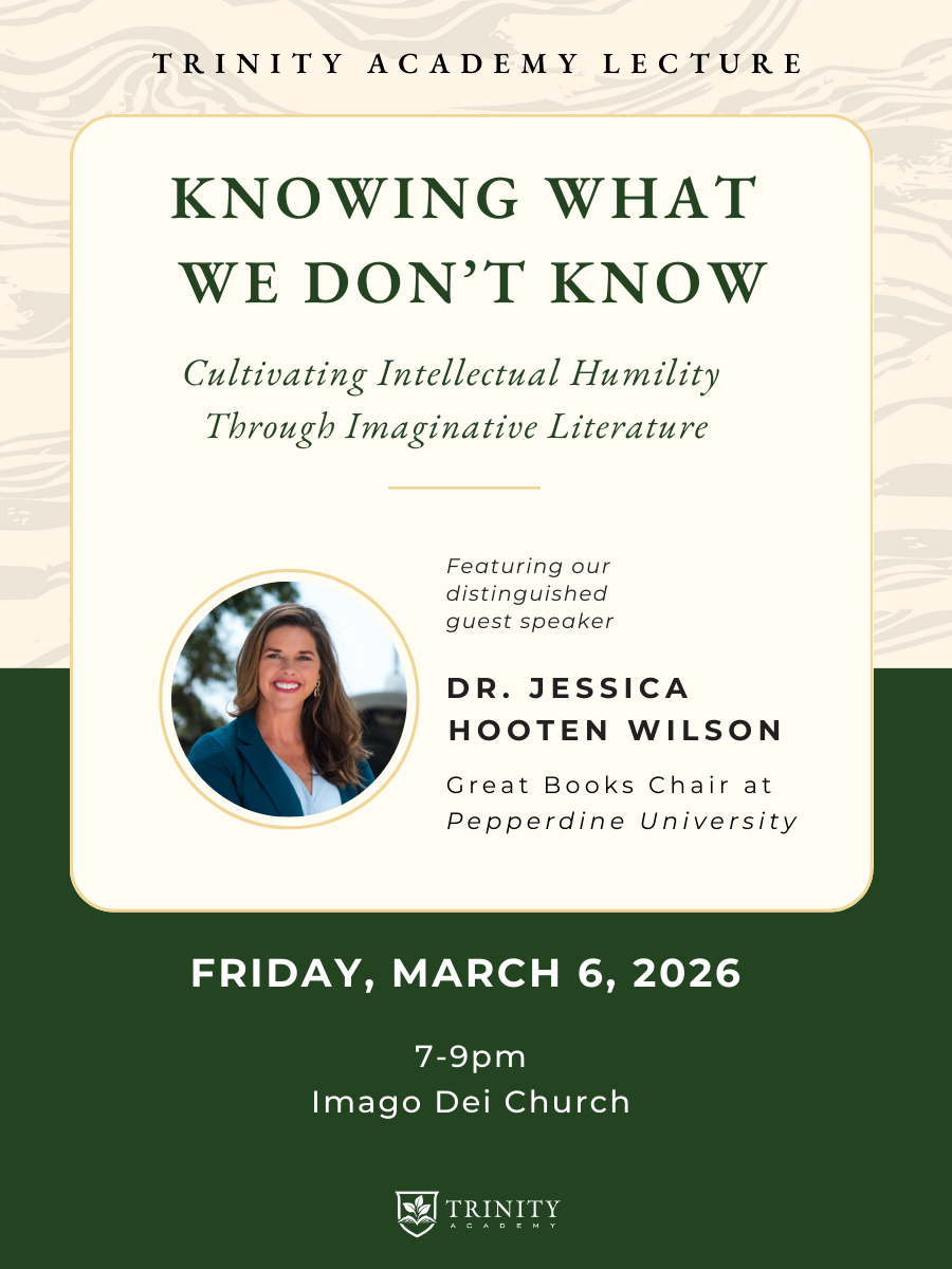 Save the date! This year's Trinity Lecture will be Friday, March 6, 2026 at 7:00 PM at Imago Dei. Trinity Academy welcomes Dr. Jessica Hooten Wilson, author, speaker, academic thinker, to speak at our upcoming Trinity Lecture. Dr. Wilson’s lecture is titled: Knowing what we don’t know: Cultivating intellectual humility through imaginative literature.